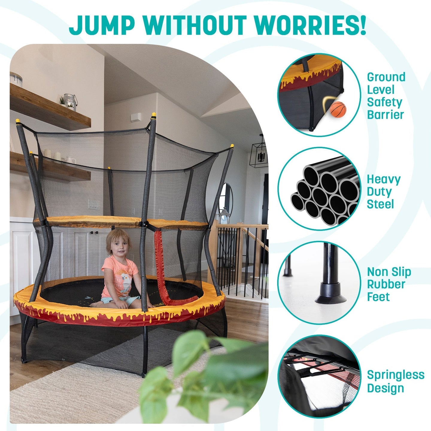 SAFETY IS OUR TOP PRIORITY: This mini trampoline for kids is safe for toddlers aged 3-7, with a secure enclosure net that is sewn directly to the jump mat. Kids trampoline with net enclosure included.